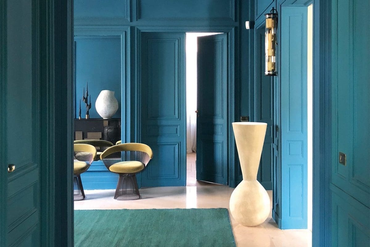 Photo Entrée : Au sol, vase XXL Imperfetto Lab. Applique In the Tube, en verre, de DCW. Au plafond, luminaire en billes d’argile d’Afrique du Sud, réalisé sur mesure. Fauteuils Platner Knoll. Commode Emmemobili, bougeoirs Ashes to Ashes en bois brûlé et bronze by William Guillon, céramique Christian Bourcereau, les 2 pour Coutume (Studio) ; tapis Elitis.