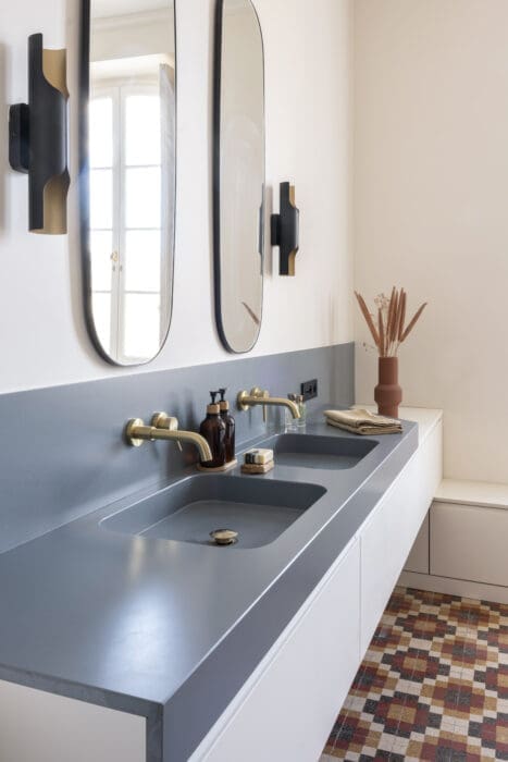 Durer, c’est aussi ce qui a guidé le choix du plan de travail et de la crédence en Dekton® Taga, dont le marbrage profond fait un pied de nez aux dictats des tendances. « Il traversera les années sans se démoder », assure Gaëlle Cuisy. Sans craindre non plus les rayures, les chocs ou les taches d’usure… Dans la salle de bains, pour le receveur, la paroi de douche, la baignoire et la double vasque, l’architecte inspirée a jonglé avec Arcilla Red, Cala Blue et Faro White, trois couleurs de Silestone®, un revêtement de surface hybride composé de minéraux et de matériaux recyclés comme le verre, une innovation exclusive également signée Cosentino. Peu conventionnel, le mariage du terracotta et du bleu donne tout son sel à cette pièce d’eau facile à vivre… ou quand le pratique se conjugue à l’esthétique !