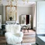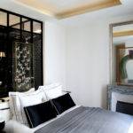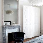 Cette chambre a été traitée tel un rêve immaculé. Le lustre « Away » de chez Transverso ressemble à un nuage qui se reflète dans le miroir doré à la feuille par Alina Czarnecka. Fauteuil « Picasso » (Baltus). La salle de bains attenante est réalisée en marbre.