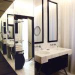Style rétro revisité dans la salle de bains où domine un noir profond. Appliques et lavabos Devon & Devon, sol en pierre de Zimbabwe (Agence Jacques Molho). Dans la chambre, liseuse Stephane Davidts, guéridon « Time piece » (Se London). Une envolée de papillons de la Maison Deyrolle apportant une touche poétique à l’ensemble.