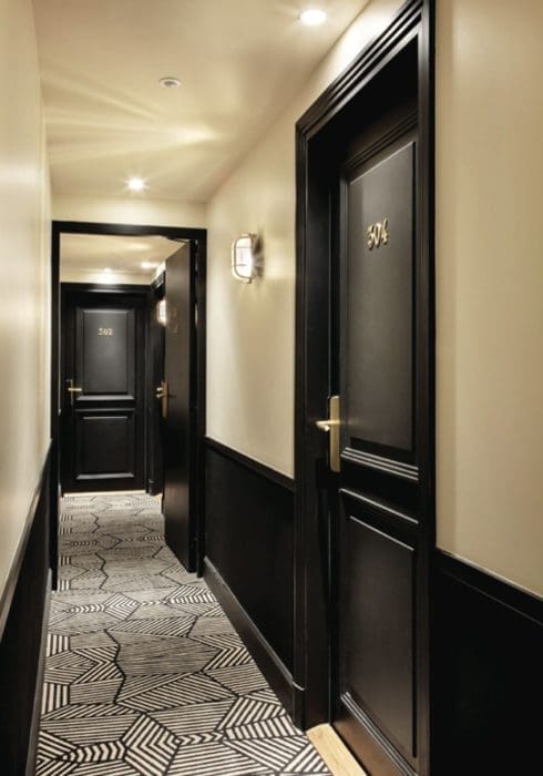 Avant d’arriver à leur chambre, les hôtes empruntent un chemin composé d’une moquette graphique contemporaine, un escalier en bois et fer forgé noir mat aux accents industriels, un ascenseur typique des immeubles parisiens, le tout éclairé par des appliques bateau conférant une identité raffinée aux parties communes.