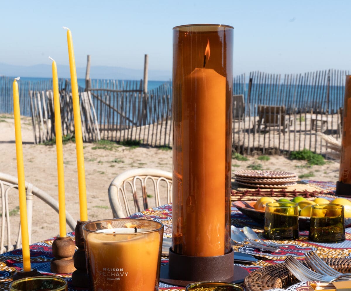 Alors que le souffle du vent éteint souvent les bougies sur les tablées estivales, la Maison Péchavy lance un photophore en trois coloris – ambré, vert acide et bleu paon – et en version transparente. Un tube en verre associé à un pied en métal qui convient à tous les types de bougies pour profiter des longues soirées d’été à la lueur de la flamme. Indispensable !