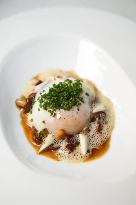 – Dressez sur chaque assiette (4) 1/4 de la poêlée champignons, échalotes, chorizo. Cassez la coquille de l’œuf et placez-le sur ce mélange. Versez autour l’émulsion de sauce poulette. Assaisonnez de ciboulette et de fleur de sel.