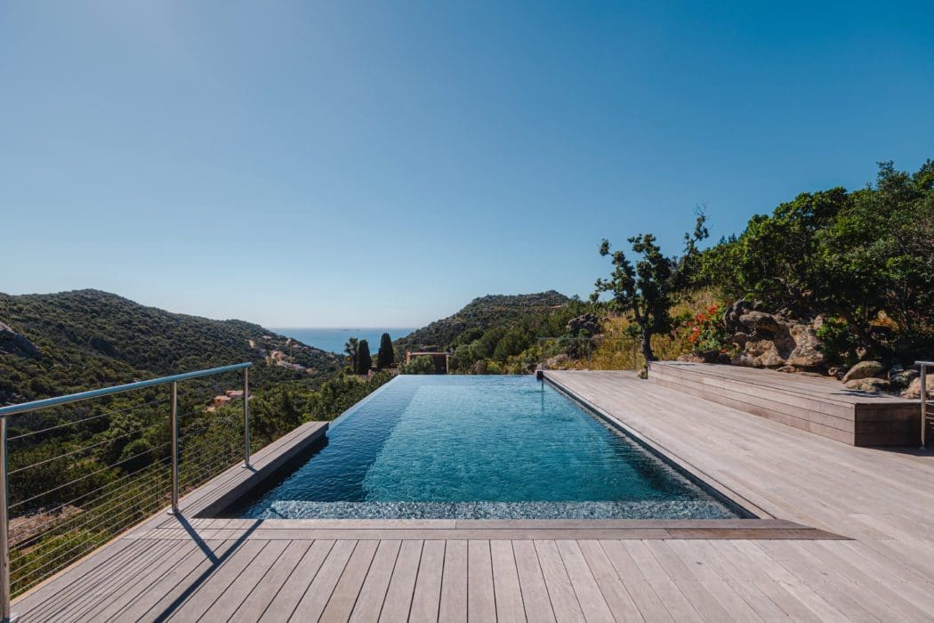 EN APESANTEUR. Parfaitement intégrée à son environnement avec sa terrasse en bois de 95 m2 littéralement posée sur les rochers, cette spectaculaire piscine à débordement sait également se faire discrète grâce à son volet roulant télécommandé avec caillebotis immergés. Réalisation Piscines de France. © Marie-Hélène Carcanague