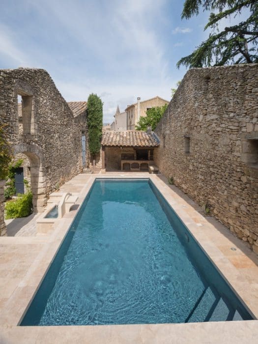 AUTHENTIQUE. Une intégration parfaite dans un cadre typiquement provençal pour ce couloir de nage de 10 x 3,5 m, réalisé sur mesure et entouré de pierres naturelles. Le sentiment d’authenticité est souligné par le liner gris, qui offre une vision de l’eau cristalline. Réalisation Aquilus. © Aquilus Uzès – FJI