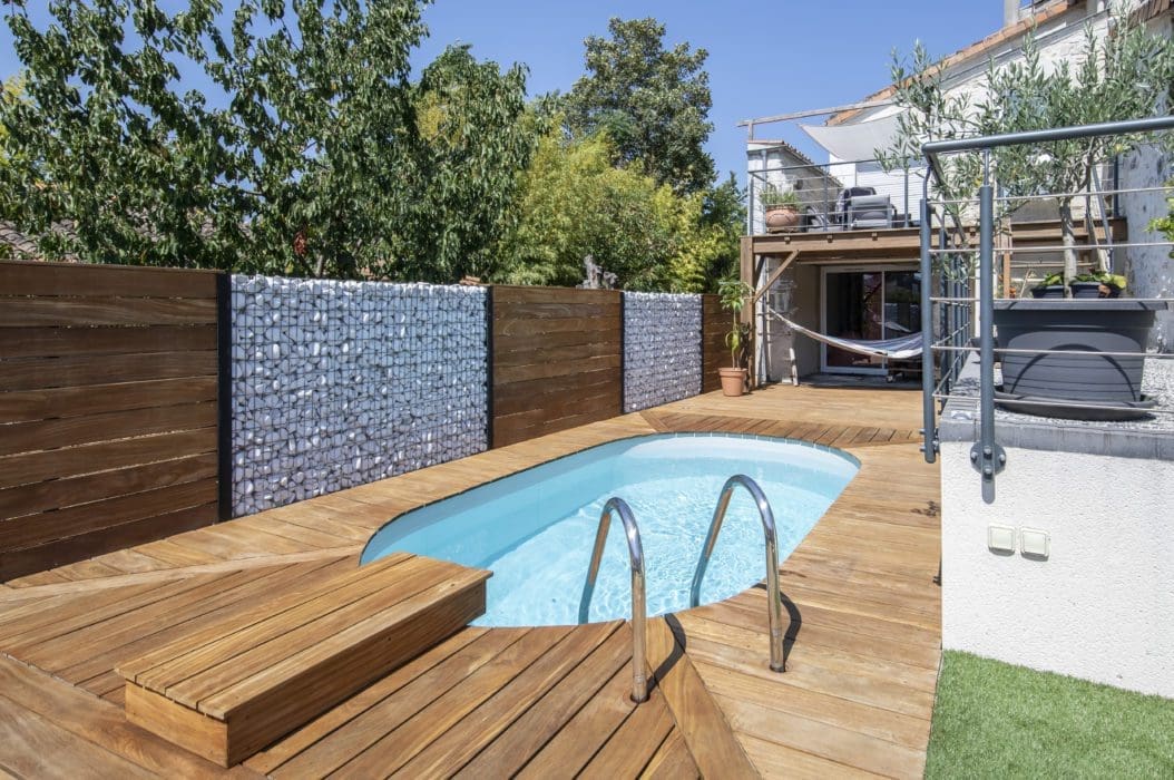 CITADINE. Intégré dans une terrasse en bois exotique évoquant irrésistiblement les nuances chaudes de l’Ipé, ce mini-bassin ovale de seulement de 9 m2 bénéficie d’un plongeoir et d’une clôture coordonnés ! À partir