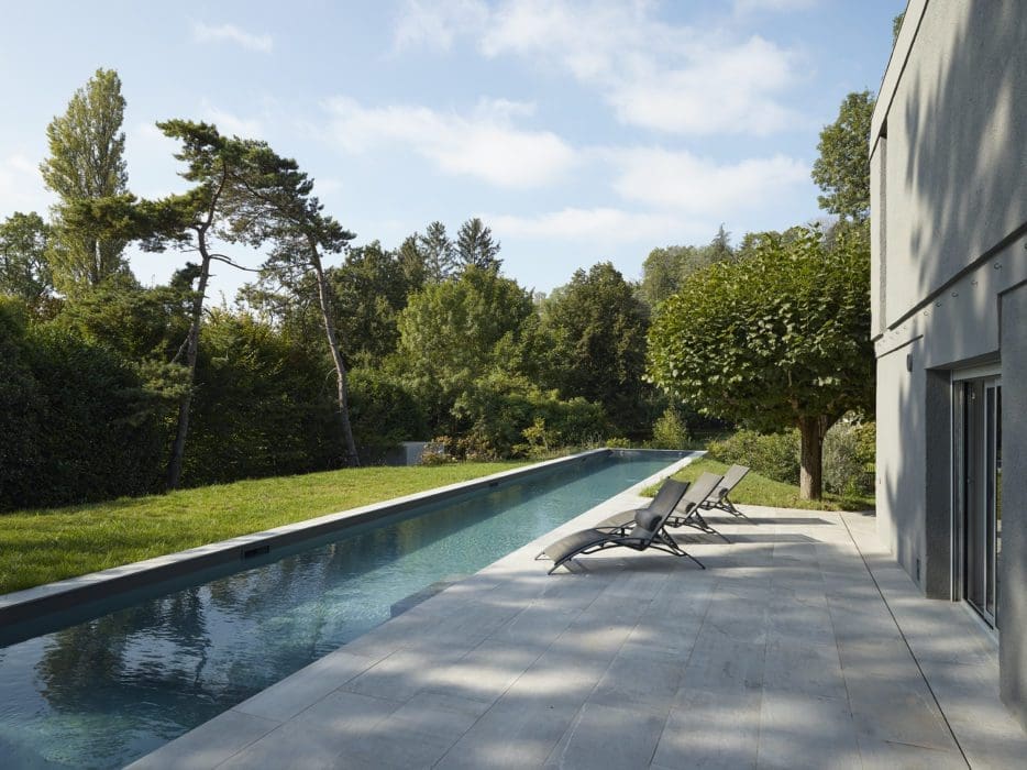 DESIGN. Les lignes épurées de ce couloir de nage sont subtilement soulignées par une plage de piscine et une terrasse en pierre bleue du Hainaut, un matériau antidérapant et résistant aux intempéries.