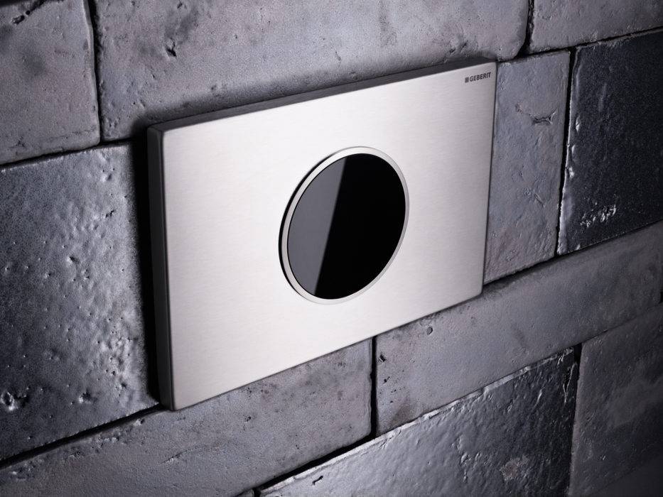 Infrarouge. Plaque de chasse d’eau sans contact, activation commandée par capteur infrarouge, déclenchement mécanique en option, économie d’eau 3/6 litres, « SIGMA10 », 750 € HT, Geberit.