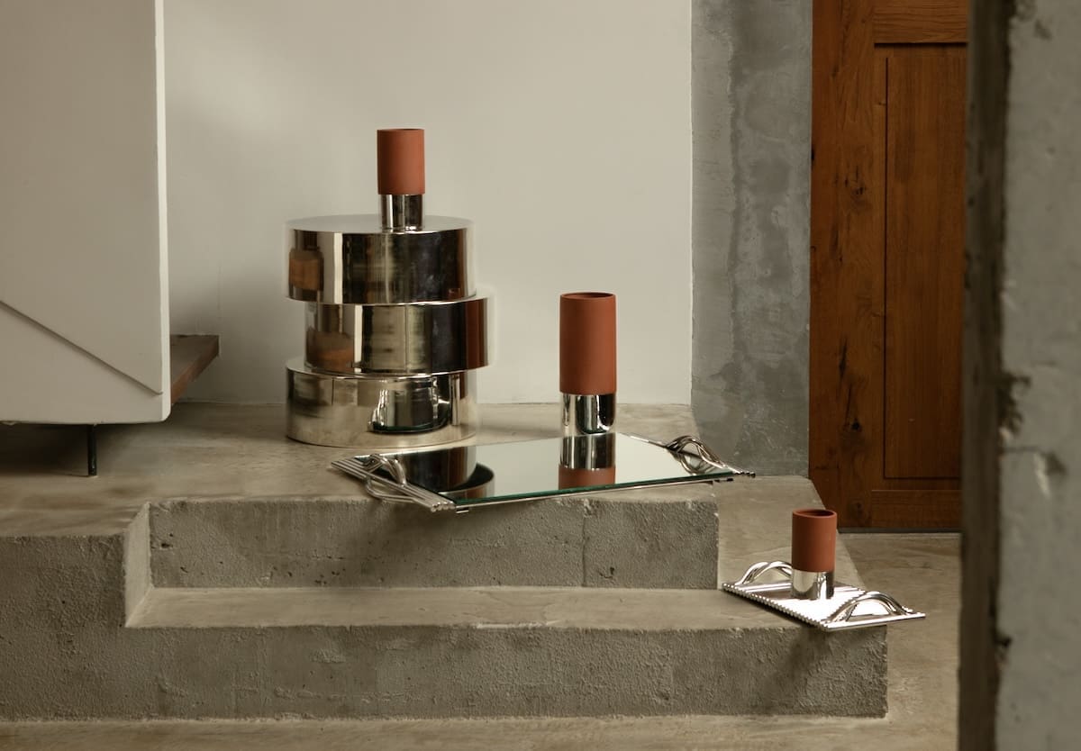 Nos pièces phares ? La chaise rayée vert kaki et crème, au laqué subtil, ainsi que le tabouret et le miroir en métal chromé, qui semblent se répondre à l’infini. Des objets sculpturaux et raffinés qui offrent à nos intérieurs une personnalité unique.