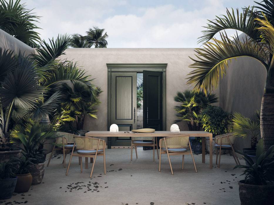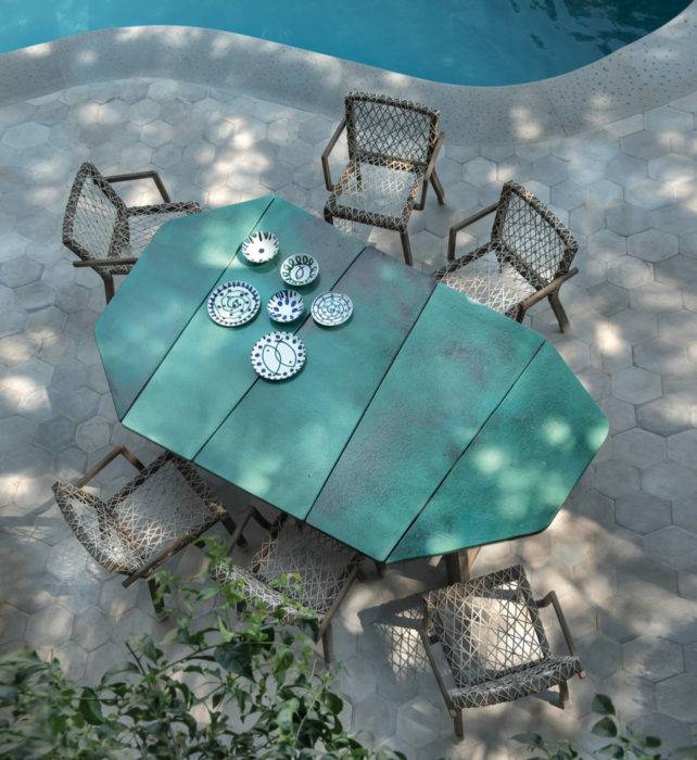 Plateau destructuré en pierre de lave émeraude et piètement en teck décapé… Cette table incarne à la perfection l’univers de la designer milanaise Paola Navone : celui d’un sud mâtiné d’exotisme, insulaire, entre Asie et Méditerranée. Table de repas « Rafael », L264 x P155 x H73,5 cm, 10 080 €, Ethimo.