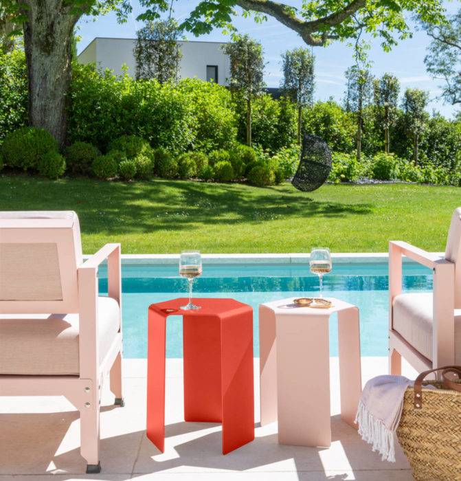 Graphiques, légers et empilables, ces bouts de canapé en aluminium se baladent indifféremment de l’intérieur à l’extérieur de la maison. Leur gabarit XS en fait l’allié des terrasses petit format. Bouts de canapé « Ponant » , Ø35 x H44 cm, 430 € la paire, Matière Grise.