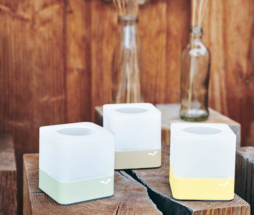 Avec leurs lignes géométriques et leur surface en polycarbonate évoquant un glaçon, les photophores « Cuub » ménagent un éclairage d’ambiance doux et poétique au jardin. Soulignés d’un ruban de métal coloré, ils distillent une note de couleur bienvenue. Photophores « Cuub », L7 x H8 x P7,5 cm, 39 € les 3, Fermob.