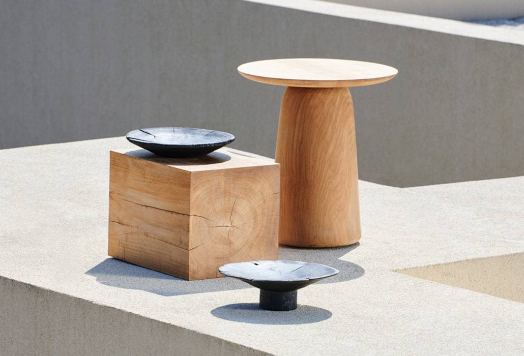Taillé d’une pièce dans un teck massif de l’est de Java, ce bout de canapé affiche un galbe organique, aux proportions douces et harmonieuses. Son veinage, ses craquelures délicates et son essence dorée et subtile évoquent irrésistiblement l’artisanat nippon. Bout de canapé « Dunes », Ø48 x H50 cm, 1 498 €, Tribù.