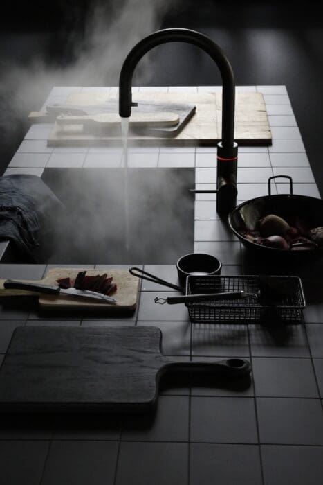 Côté design, il y en a pour tous les goûts : nombreuses formes, avec ou sans douchette, finition chrome, acier inoxydable, noir, cuivre, cuivre rosé, gun metal, laiton patiné et plaqué or 24 carats. Quooker s’installe très facilement à la place d’un robinet classique et nécessite juste de réserver un quart de la place d’un sous-évier classique pour les réservoirs (que l’on peut aussi déporter jusqu’à 1,50 m). C’est autant de place gagnée sur le plan de travail, puisque vous n’aurez plus besoin de bouilloire, de machine à eau gazeuse, ni de carafe filtrante.