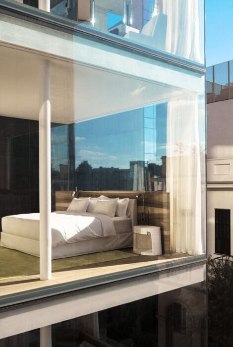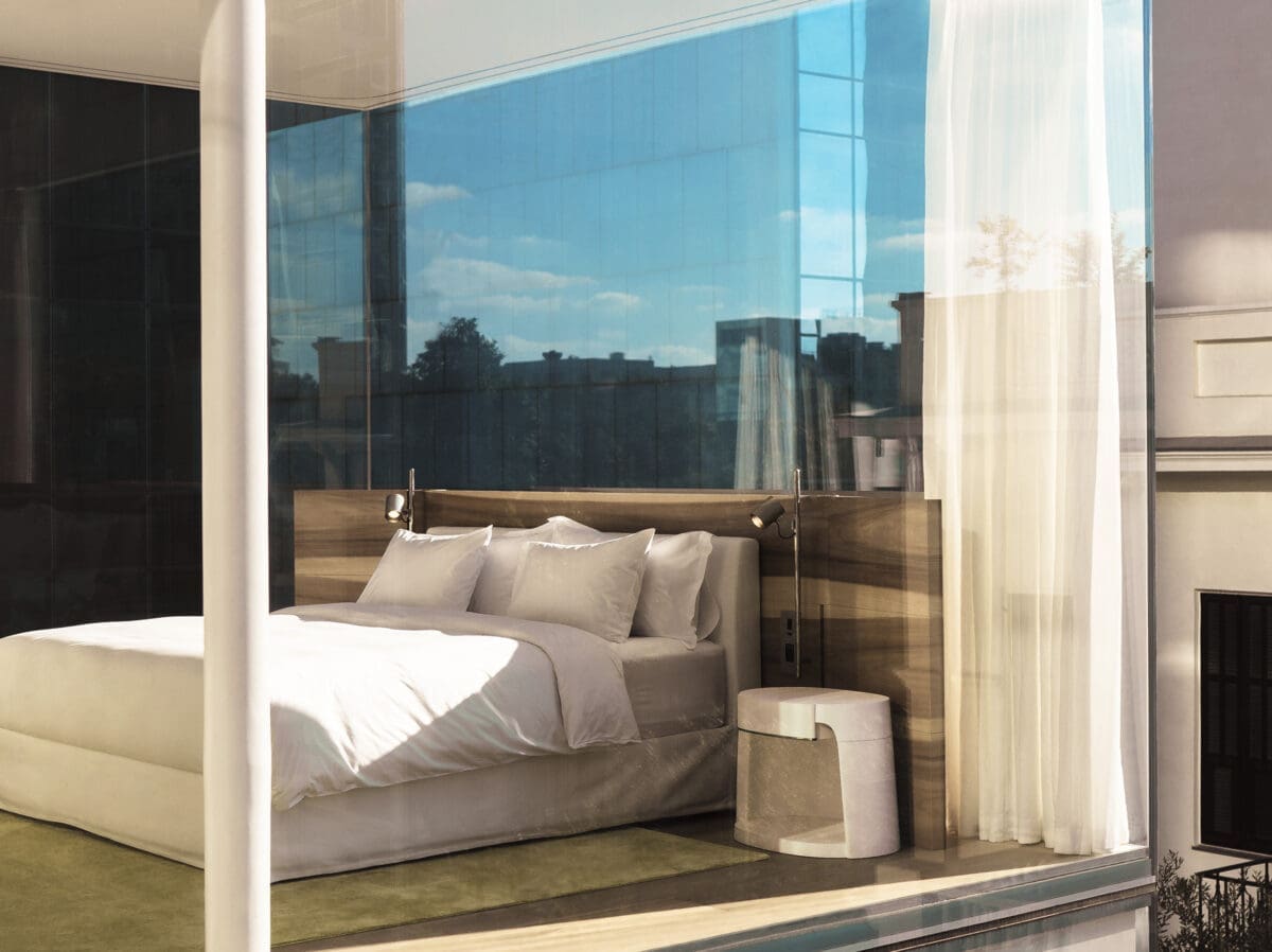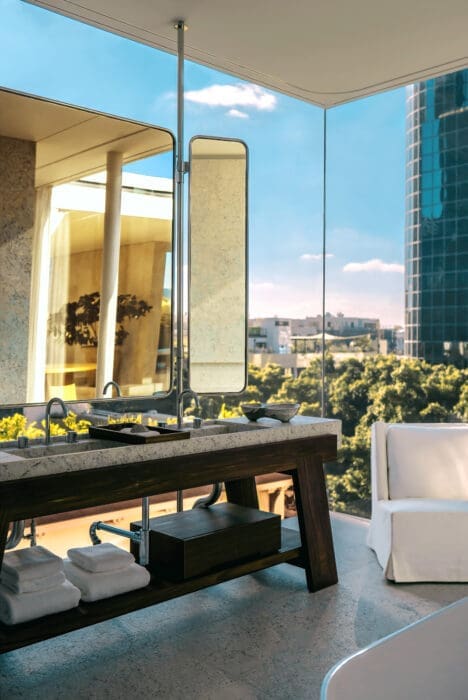 Une volée de marches, un jardin végétalisé par Piet Oudolf, paysagiste qui a imaginé la High Line de New York, une façade immaculée, une gigantesque cage d’ascenseur vitrée. Ainsi s’aborde le R48, sis au 48 du boulevard. Choc esthétique, promesse d’un séjour rare, serein, dans le quartier le plus agité de l’ancienne Jaffa, mix entre les Champs-Élysées et la 5e Avenue. La longue piscine en terrasse, où se déforme le reflet des immeubles alentour et des graminées ébouriffées de Piet Oudolf, ajoute au charme de cet hôtel, le premier signé par le studio parisien Liaigre. Pour transformer ce bâtiment Bauhaus classé au patrimoine mondial de l’Unesco tout en conservant son caractère, il fallait l’intelligence d’une équipe d’architectes, de designers et d’agenceurs capable de s’imprégner des éléments existants et des particularités de Tel-Aviv, à la fois urbaine et balnéaire.