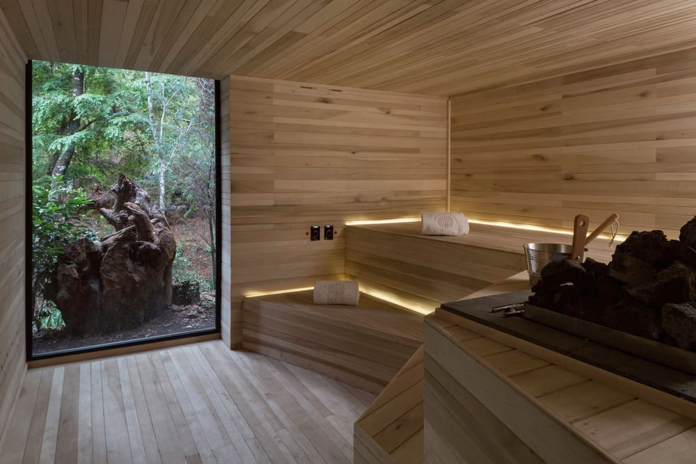 Au sous-sol de la partie privée de la maison, un spa a été construit avec tous les équipements nécessaires : sauna, hammam, salles d’eau et salles de massage. Dans ce projet, les aspects environnementaux ont été pris en compte, ce qui a permis de prendre des décisions qui favorisent l’économie énergétique et la réutilisation des eaux usées grâce à l’installation d’une station de traitement qui les récupère pour l’arrosage. Le bois est éco-responsable puisque pratiquement tout est local et issu de la reforestation.
