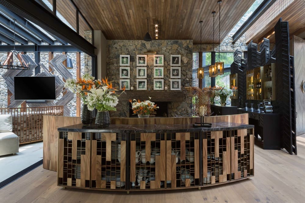 Dans la partie commune de la maison, on retrouve une cave à vin qui peut contenir jusqu’à quatre cents bouteilles de vin. À côté se trouve la salle multimédia, intégrée au bar. Les détails et revêtements sont faits d’un bois local, le parota. Pour la salle multimédia, un canapé huit places et deux fauteuils individuels ont été choisis et réunis autour d’une table-cheminée en pierre noire et pièces d’acier, spécialement créées par Luciano Gerbilsky pour ce projet.