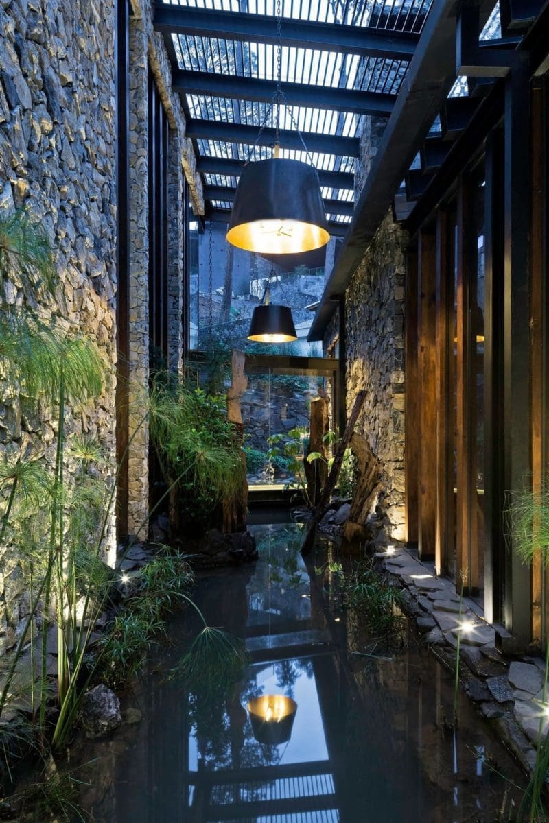 Ces deux parties formellement et fonctionnellement différenciées sont divisées par une rivière artificielle créée à partir de la rivière naturelle qui longe pratiquement tout le terrain. La maison est conçue dans un déploiement d’espace ample et sans dévoilement d’éléments structuraux, ce pourquoi aucune colonne n’est visible et les recouvrements sont ancrés aux larges murs en pierre et à la trame structurelle des poutres en acier.