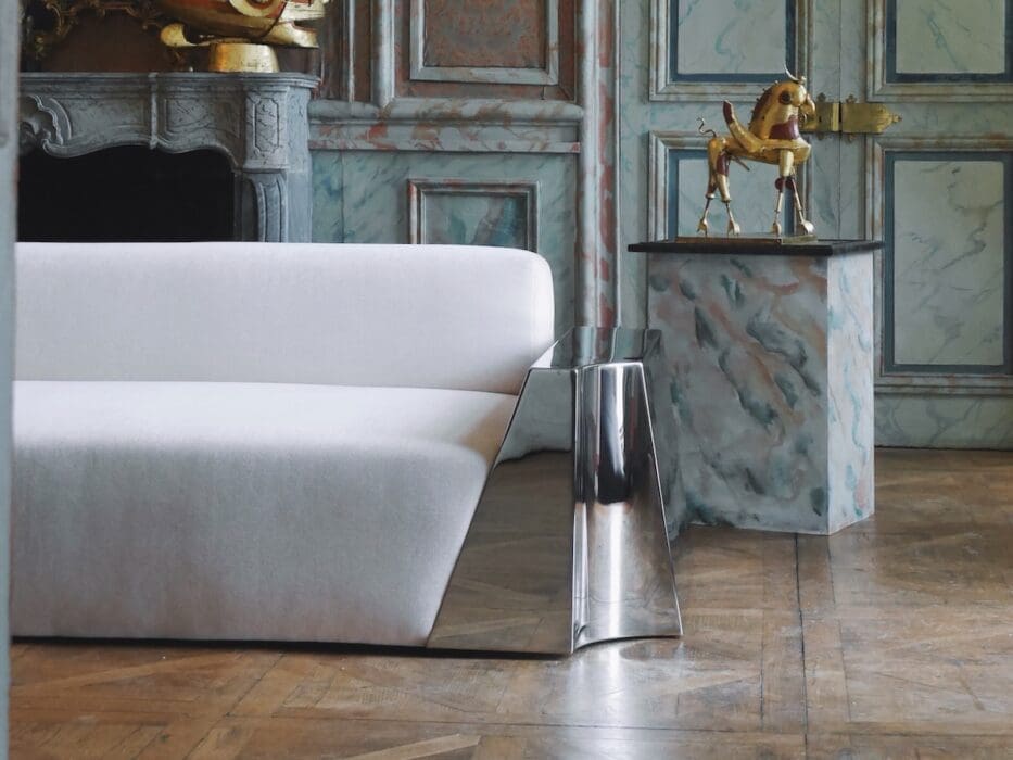 On aime travailler le métal et l’associer à une autre matière plus douce, comme le velours ou le cuir. On se plaît à jouer sur la tension entre l’aspect massif et brutaliste, et le confort, la douceur.
