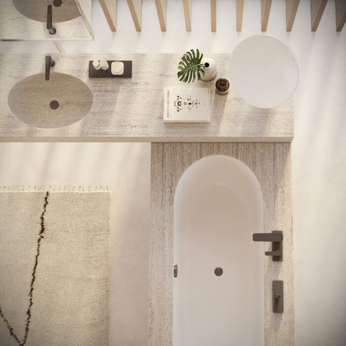 Proposé dans cinq coloris inspirés de la nature, spécialement développé pour un traitement vertical (murs, mobilier…), le revêtement en Dekton® « Ukiyo » enveloppe la salle de bains d’une atmosphère japandi chic et minimaliste. Dimensions sur mesure, prix sur demande, Cosentino.