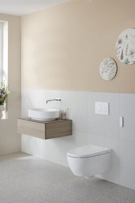 Pourvu d’un design soigné et d’une technologie innovante de douchette WhirlSpray (jet d’eau dynamiquement enrichi en air et diffusé en spirale), le nouveau WC lavant « Aquaclean Alba » conjugue confort, hygiène et consommation raisonnée d’eau. L. 37,5 X P. 56,5 cm, 995 €, Geberit.