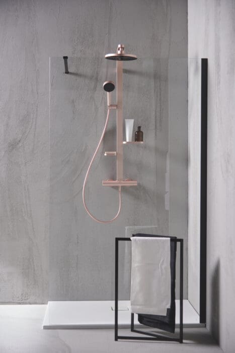 Composée de douches avec tablettes, « beauty barres », ensemble de miroirs et accessoires, la collection « Alu + » permet de créer des solutions adaptées à l’espace disponible. En aluminium recyclable, existe en finition noir mat, argent brossé, rose brossé,prix sur demande, Ideal Standard.