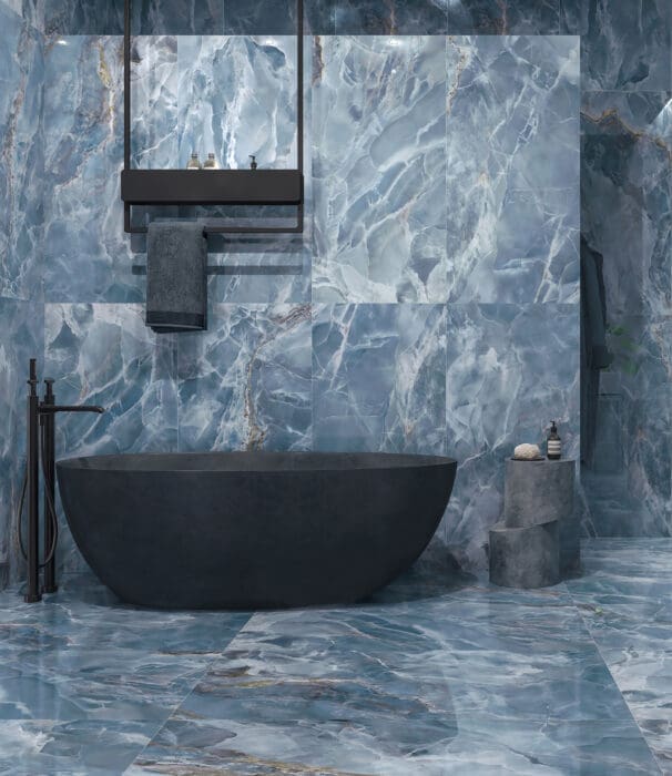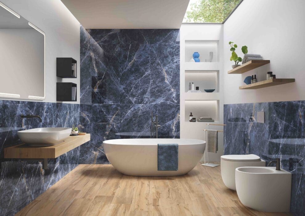 Avec la collection de carreaux en grès cérame poli « Ocean Blue », le motif marbre se pare de tonalités indigo poétiques. L. 120 x H. 60 cm, 62,99 € le m2, Iperceramica.
