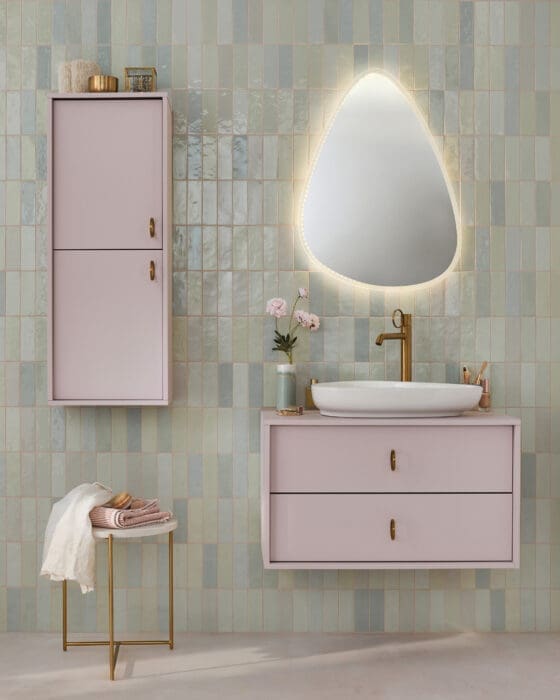 Éléments rectilignes rose poudré, robinetterie précieuse, vasque aux contours organiques… Cette année, l’ambiance boudoir épouse l’air du temps, sans renoncer à la douceur. Meuble vasque « Vivienne Signature », L. 79,9 x H. 45,2 x P. 45,2 cm, 1 500 €, Jacob Delafon.