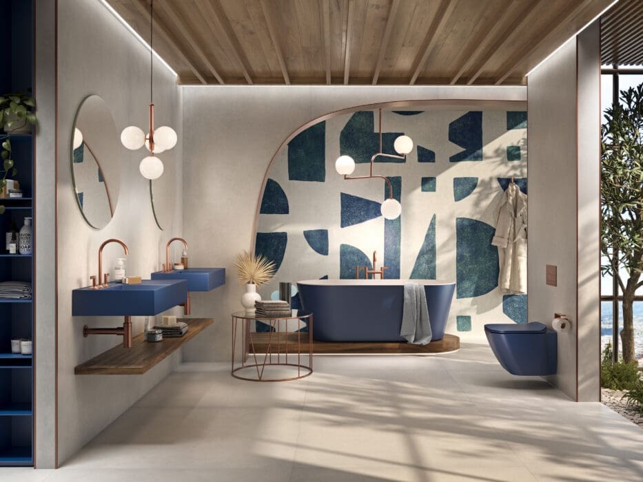 Quand le papier peint vogue entre codes modernistes et influences méditerranéennes, le charme opère à coup sûr… Papier peint « Skins Art Abstract Blue », 33,37 € le m2, L’Antic Colonial, Porcelanosa.