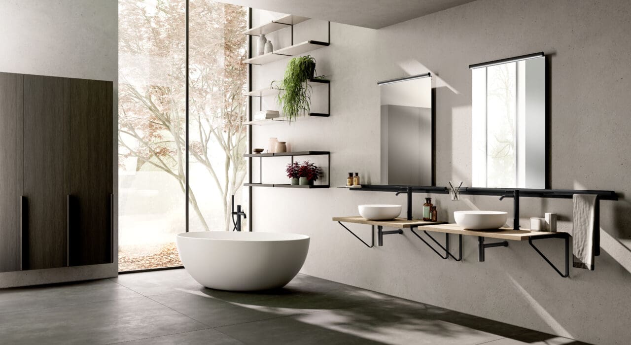 Plans vasque en métal et bois comme en lévitation, composition d’étagères longilignes, jeu d’aplats noirs et blancs dynamiques… Conçue par le studio Spalvieri & Del Ciotto, la salle de bains esprit loft « Stilo » affirme son parti-pris graphique.Prix sur demande, Scavolini.