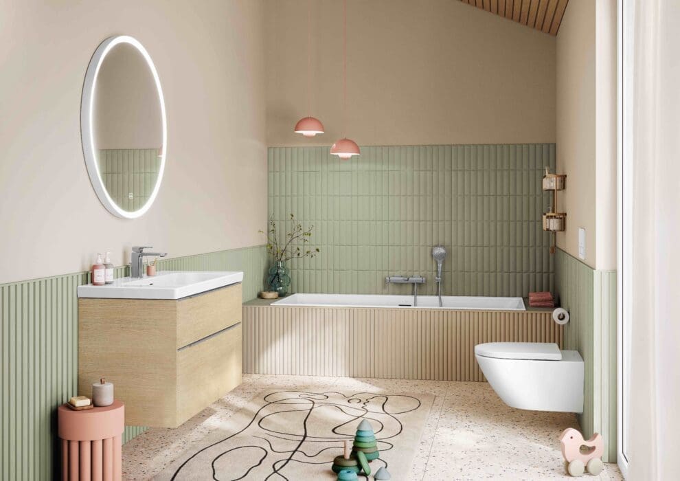 Revamper la salle de bains grâce à des façades de meubles et panneaux muraux en HPL hyper-résistants, déclinés dans un éventail de couleurs sourdes, acidulées ou plus tendres.« Rauvisio Crystal », teinte « Menta » prix sur demande, Rehau.