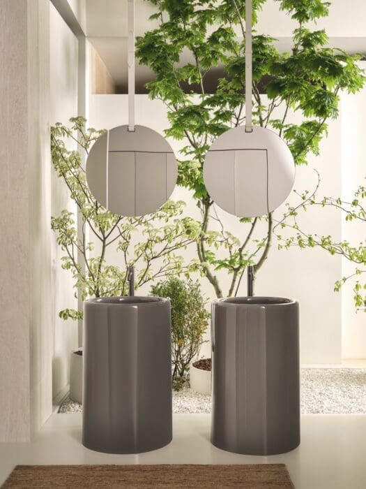Sculpturales, ces vasques colonne en céramique à la couleur galet invitent des harmonies zen et raffinées dans la salle de bains. « Itaca », Ø 53 x 85 cm. Prix sur demande, Ceramica Cielo.