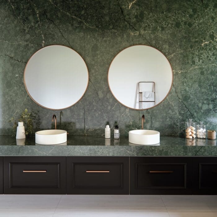 Des vastes tiroirs coulissants abritant de multiples modules de rangement, une surface en granit « Black Cosmic » agrémentée de veines de quartz blanc et de grappes de mica… Le meuble de salle de bains « Blade Lab » conjugue raffinement et esprit pratique. Prix sur demande, Modulnova.