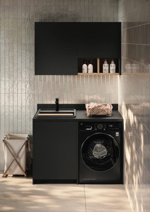 Surface en Duratek® d’une robustesse à toutes épreuves, dimensions ultra-fonctionnelles, planche à linge modulable intégrée… La vasque « Laundry » révolutionne l’aménagement de la buanderie. L 57 x P 50 cm, 620 €, Elleci.