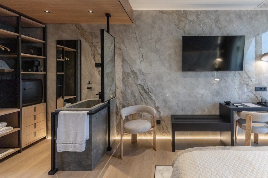 Avec ses dimensions bien pensées (Ø 111,7 cm / H 55 cm) et sa surface en Dolotek® assurant une durabilité et une résistance exceptionnelles, la baignoire îlot esprit spa « Round » s’invite même dans les espaces les plus exigus. 2 582 €, Acquabella.