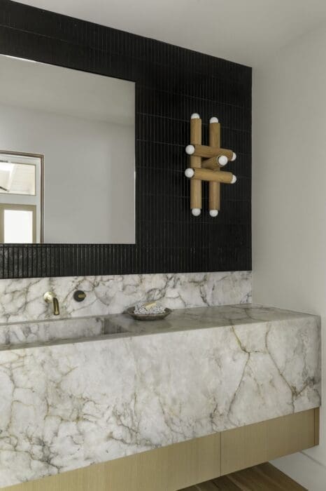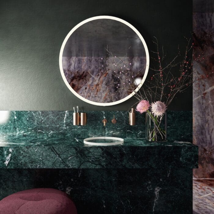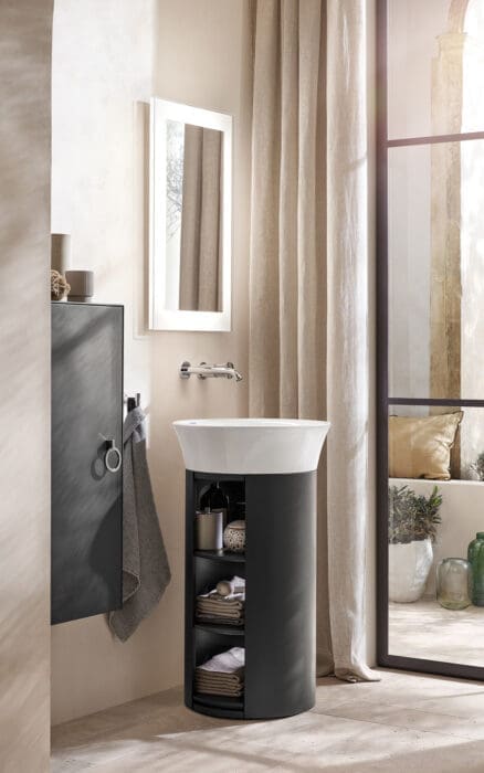 Aussi esthétique que pratique, la vasque totem se distingue par son allure sculpturale et son faible encombrement au sol. Un physique avantageux qui lui permet de libérer les murs pour y installer des rangements verticaux du sol au plafond. Côté look, elle se décline dans une vaste palette de finitions et coloris et s’adapte ainsi à tous les styles d’intérieurs. En outre, de nombreuses vasques totem disposent de leurs propres rangements intégrés, idéals pour dissimuler les accessoires disgracieux, mais indispensables, tels que les brosses à dent, dentifrices et autres cotons-tiges… La vasque à poser, quant à elle, se décline dans des formats compacts qui, associés à un meuble suspendu, permettent d’optimiser le plan de toilette tout en apportant une dimension design et élégante à la pièce. On l’associe de préférence avec une robinetterie encastrée afin de préserver la légèreté de l’ensemble… Le détail qui fait la différence ? Le choix d’un grand miroir pour refléter la lumière et accentuer la profondeur visuelle de la pièce. Pour continuer à agrandir visuellement l’espace, n’hésitez pas à multiplier les sources lumineuses en associant un éclairage principal – suspension ou LED – avec des appliques de part et d’autre du miroir, et, pourquoi pas, des bandes LED sous les meubles ou dans une niche de douche pour