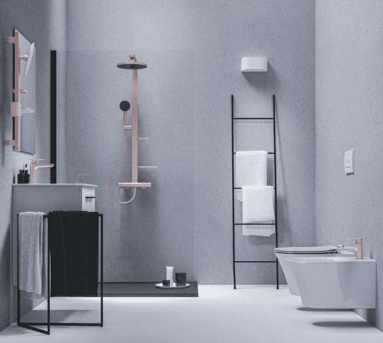 FEELING BLUE. Le secret pour rehausser le teint d’une salle de bains monochrome, à l’image de cette pièce bleu-gris ? Miser sur des accessoires de couleur vive, comme cette robinetterie rose bonbon. « IS Multisuite », 3 300 € l’ensemble, Ideal Standard.