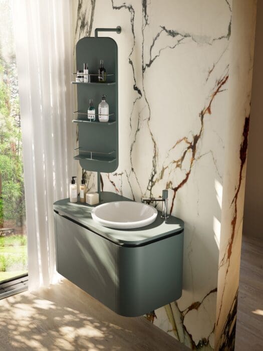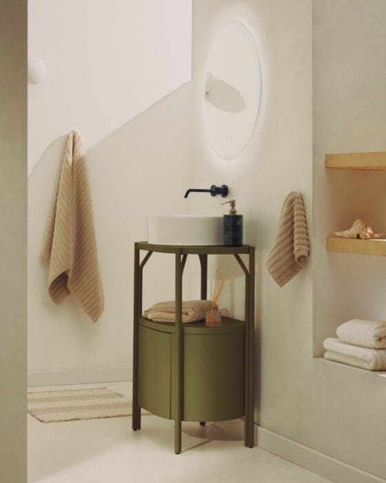 KAKI À CROQUER. Des courbes irrésistibles pour ce modèle en acier et MDF laqué vert, associé à une robinetterie encastrée. « Arely », 729 €, Kave Home.