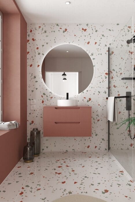 TERRE À TERRE. Un coloris terracotta ultra-désirable et une surface en MDF ondulé très tendance pour ce meuble au rapport qualité-prix imbattable, surmonté d’une vasque ronde à poser en céramique mat. « Léon », 439 €, Aurlane.