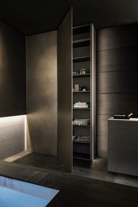 SUR MESURE. Posé en pleine hauteur, en contrepoint d’un bloc lavabo sculptural en pierre Piasentina, ce meuble de rangement est fermé par des portes coulissantes. « Blad », design Carlo Presotto et Andrea Bassanello, prix sur demande, Modulnova.
