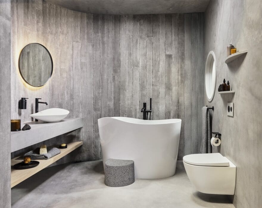 NIPPON ATTITUDE. Inspiré par les bains japonais, ce modèle en Stonex® avec siège et marche-pied (en option) intégré conjugue résistance, durabilité et style. « OHTAKE », design Rodrigo Ohtake, 3 480 €, Roca.