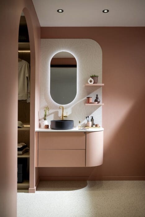COUP DE BLUSH. Des lignes tout en rondeur et un coloris pêche, coordonné au dressing attenant, pour ce boudoir des temps modernes, composé d’un miroir rétroéclairé, d’étagères et d’un meuble vasque. À partir de 3 800 € hors robinetterie, Schmidt.