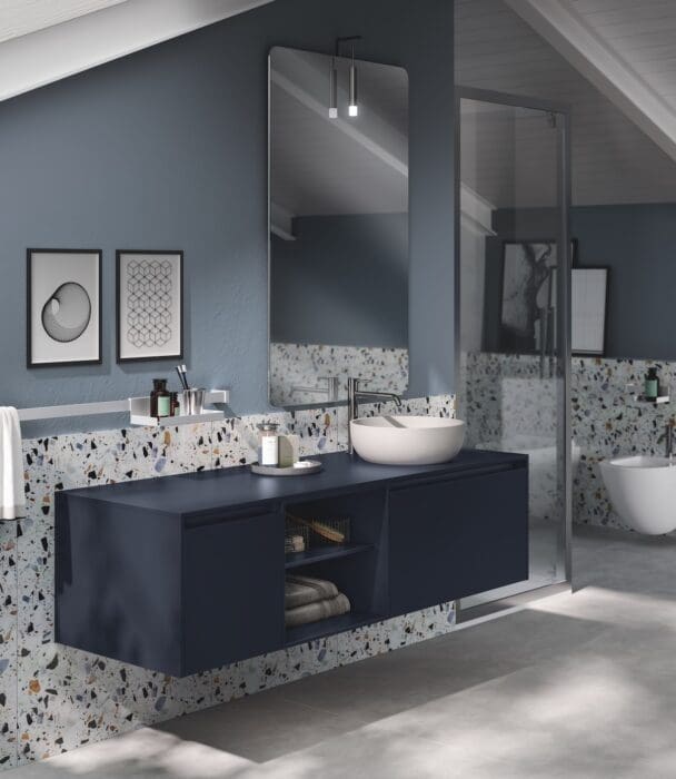 MADE IN ITALY. Ce meuble suspendu laqué mat Bleu Moon est sublimé par une crédence en Terrazzo, LA grande tendance du moment dans la salle de bains, photo à l’appui ! « Miko », design Vuesse, prix sur demande, Scavolini.