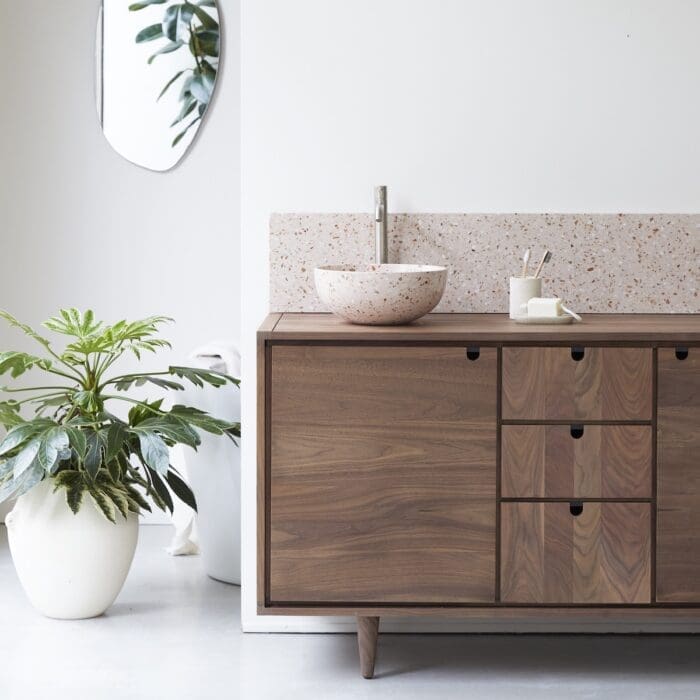 RESTER DE BOIS. Inspiré d’une enfilade vintage modernisée, ce meuble sous vasque en noyer massif certifié FSC, finition huilée, envoie du bois. « Jonàk », 1 399 €, Tikamoon.