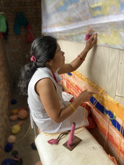 Une artisane réalise un tapis noué main, dans un atelier de Katmandou, au Népal. © DR