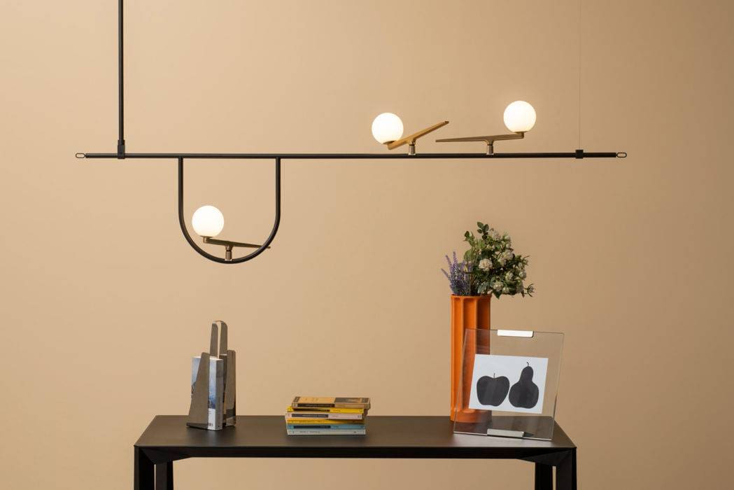 « Yanzi Suspension 1 », en acier laqué, laiton et verre soufflé, design Neri & Hu, éclairage Led, L156 x 31 cm, 1 350 €, Artemide.
