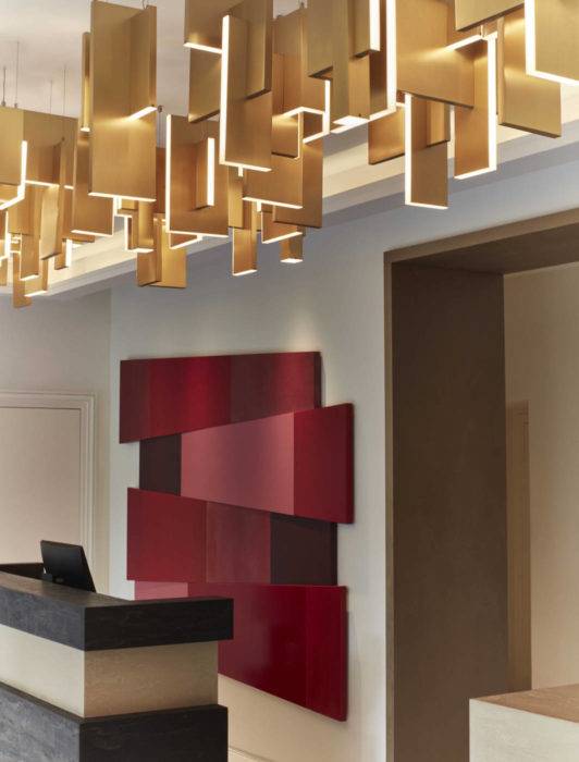 « Yocto », composition de trois formes rectangulaires fixes en acier peinture epoxy avec des coins arrondis, éclairage Led avec variateur, H93 x L94 x P94 cm, hauteur réglable de 10 à 200 cm. également disponible sur mesure, made in France, 3 957 €, Le Deun Luminaires.