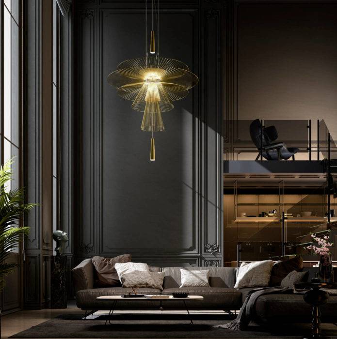 Lustre « Gravity » en métal finition dorée, design Kateryna Sokolova, H170 x Ø120 cm, 3 250 €, Forestier.