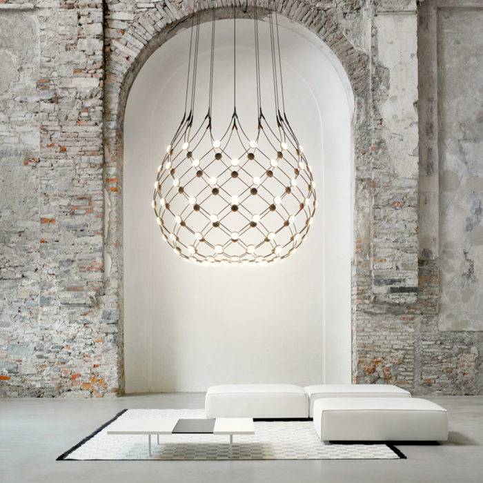 « Mesh », suspension en acier et méthacrylate. Design par Francisco Gomez Paz, récompensé par le prix Red Dot Award dans la catégorie « Best of the Best » en 2016. Led 65W, L100 x H190 x P100 cm, fabrication italienne, 4 096 €, Luceplan chez Nedgis.