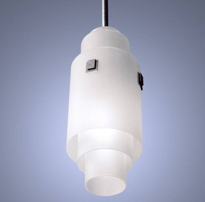« Suspension 215 », pièce de collection en verre optique extra-blanc créée dans les années 30. H62 cm (hors hauteur de la tige, réalisée sur mesure), diamètre 25 cm, finition à la demande (ici nickel mat), à partir de 10 670 €, Atelier Jean Perzel.